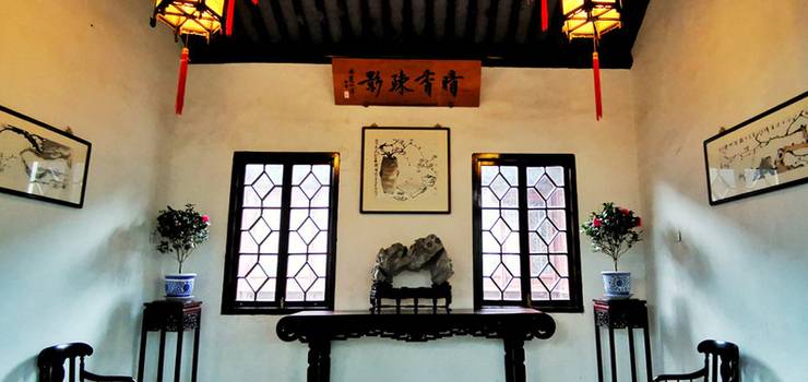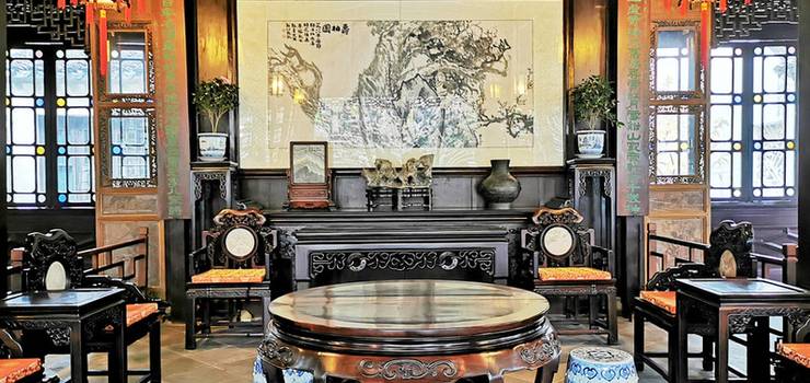 古色古香的诸葛鼓和天然几、花几、供桌、太师椅共置于一室,仍可看到当年高僧讲公案的气势。登楼南望,对面正是狮子林的假山群,室内室外皆是美景。