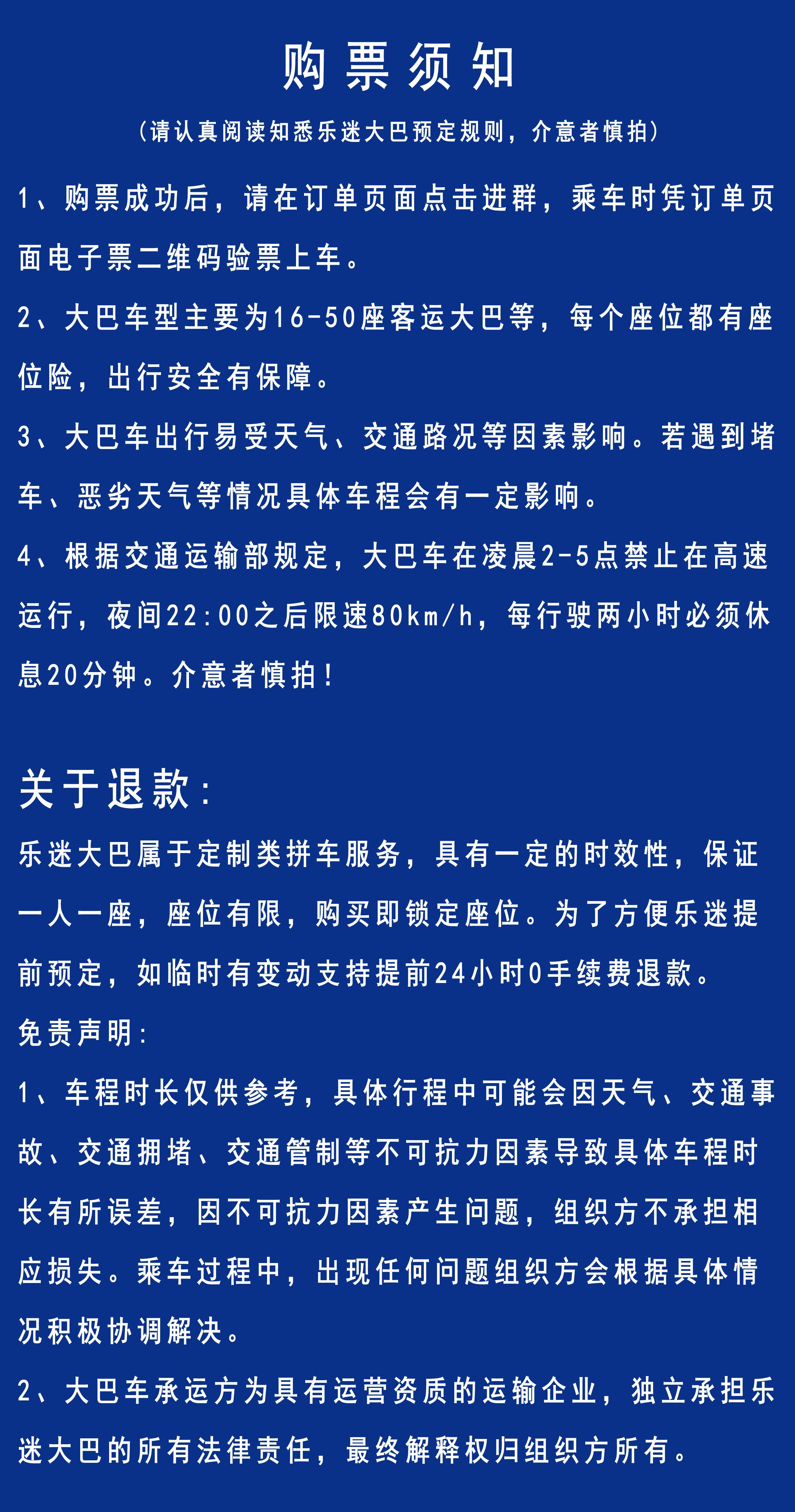 1、禁止携带易燃易爆物品 2、一人一座大小同价,无固定座位号